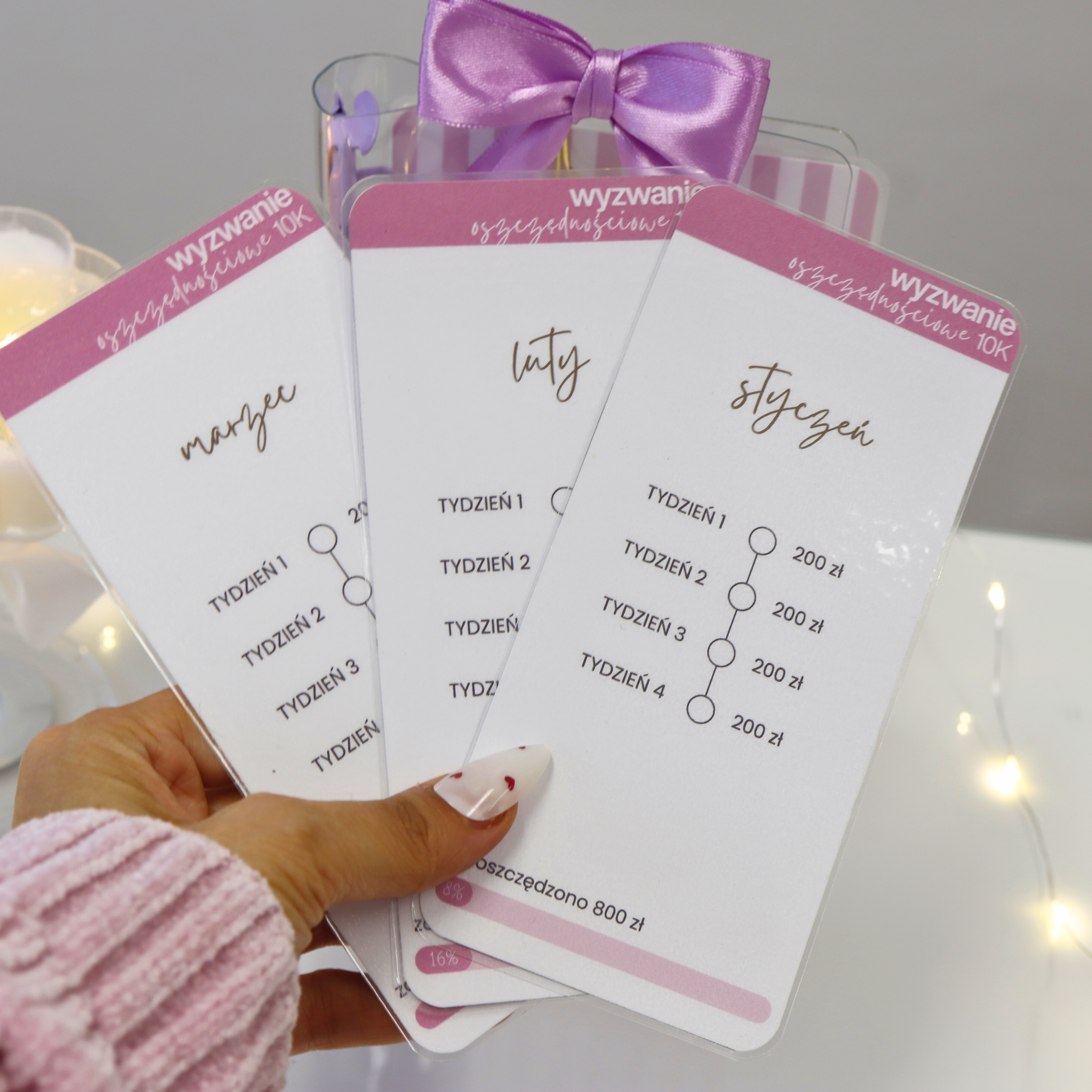 Każda karta posiada pasek postępu w procentach, który pozwala śledzić postępy i daje realne poczucie kontroli nad finansami. Widoczny progres działa motywująco i pomaga wytrwać do końca.