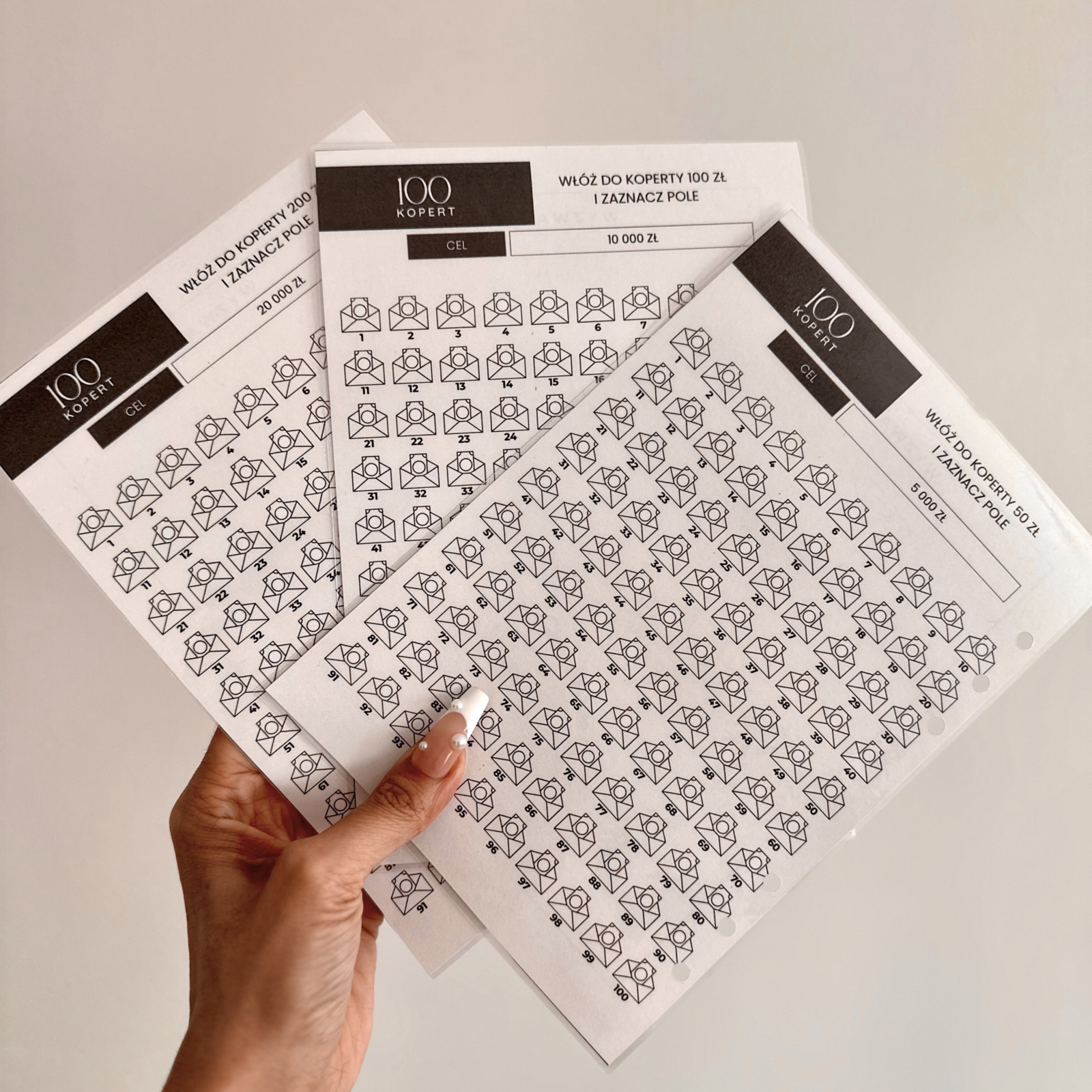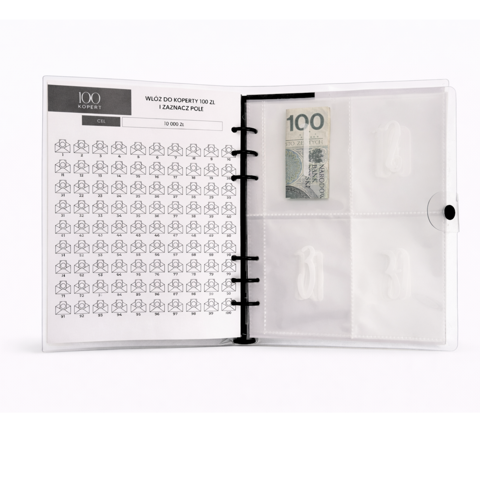Organizer w formacie A5 zawiera 100 kieszonek, każda z nich ponumerowana od 1 do 100 – Twoim zadaniem jest odkładać do kieszonek wyznaczone kwoty.